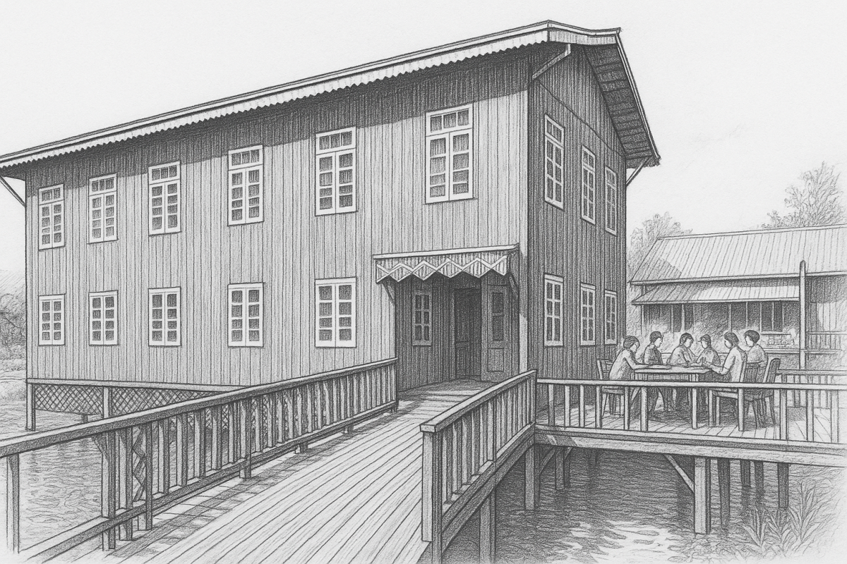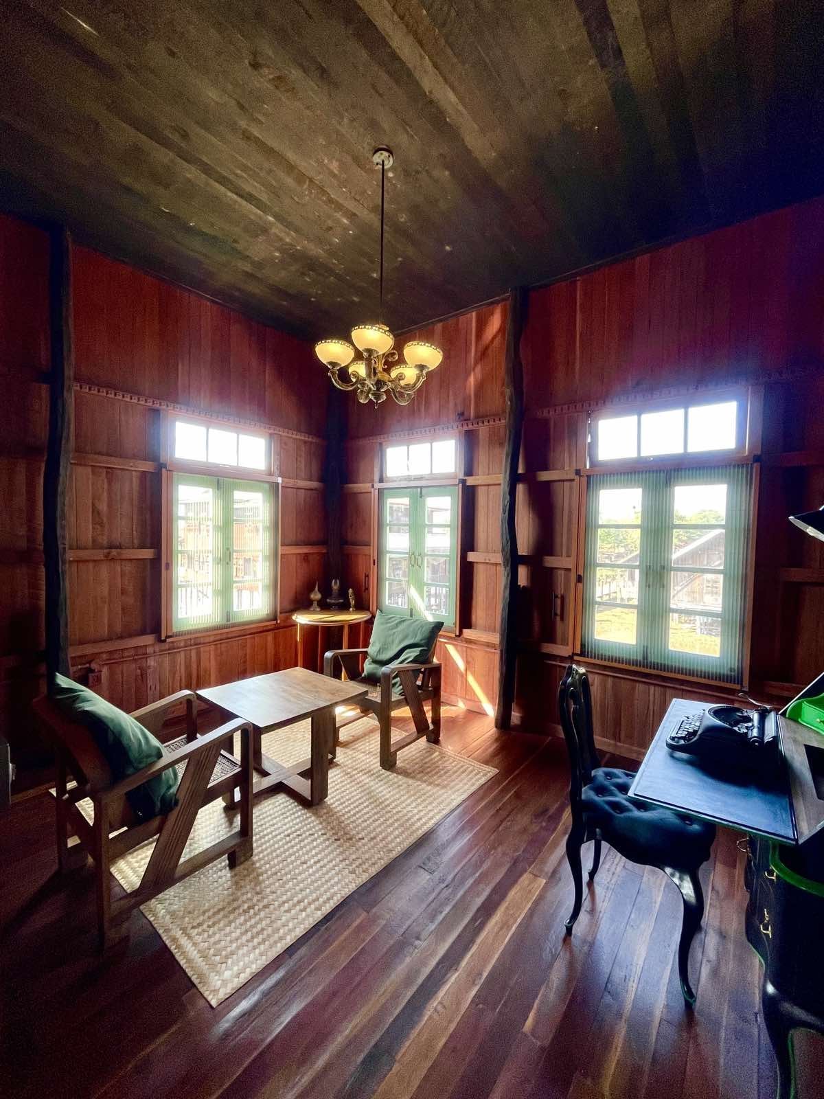 First floor: This floor includes a reading room and four modular sleeping pads, which can be arranged as two bedroom-suites with private living areas, or as individual rooms. The layout accommodates up to eight guests in total.